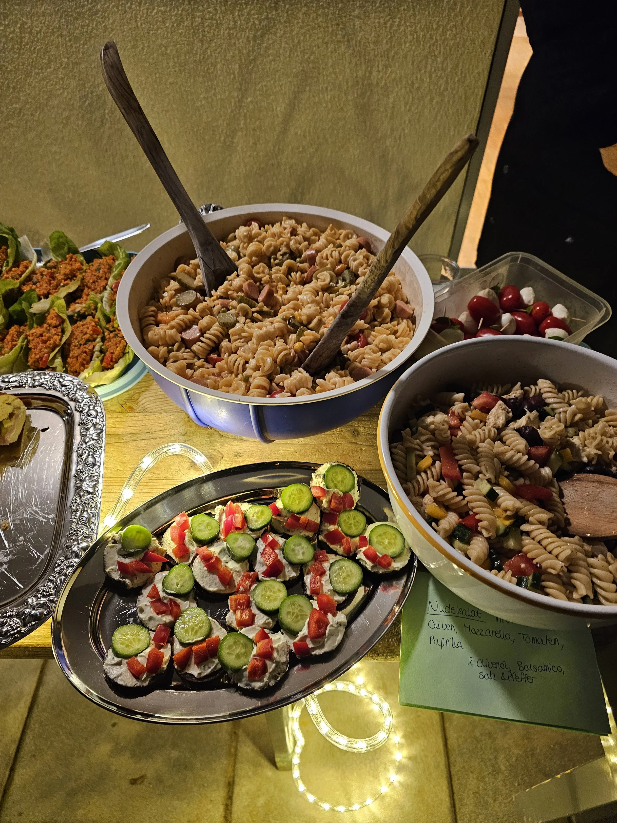 Zurück im Kinderhaus wartete ein Mitbring-Buffet. Jede Familie hatte etwas beigesteuert, sodass eine vielfältige Auswahl an Speisen entstand.
