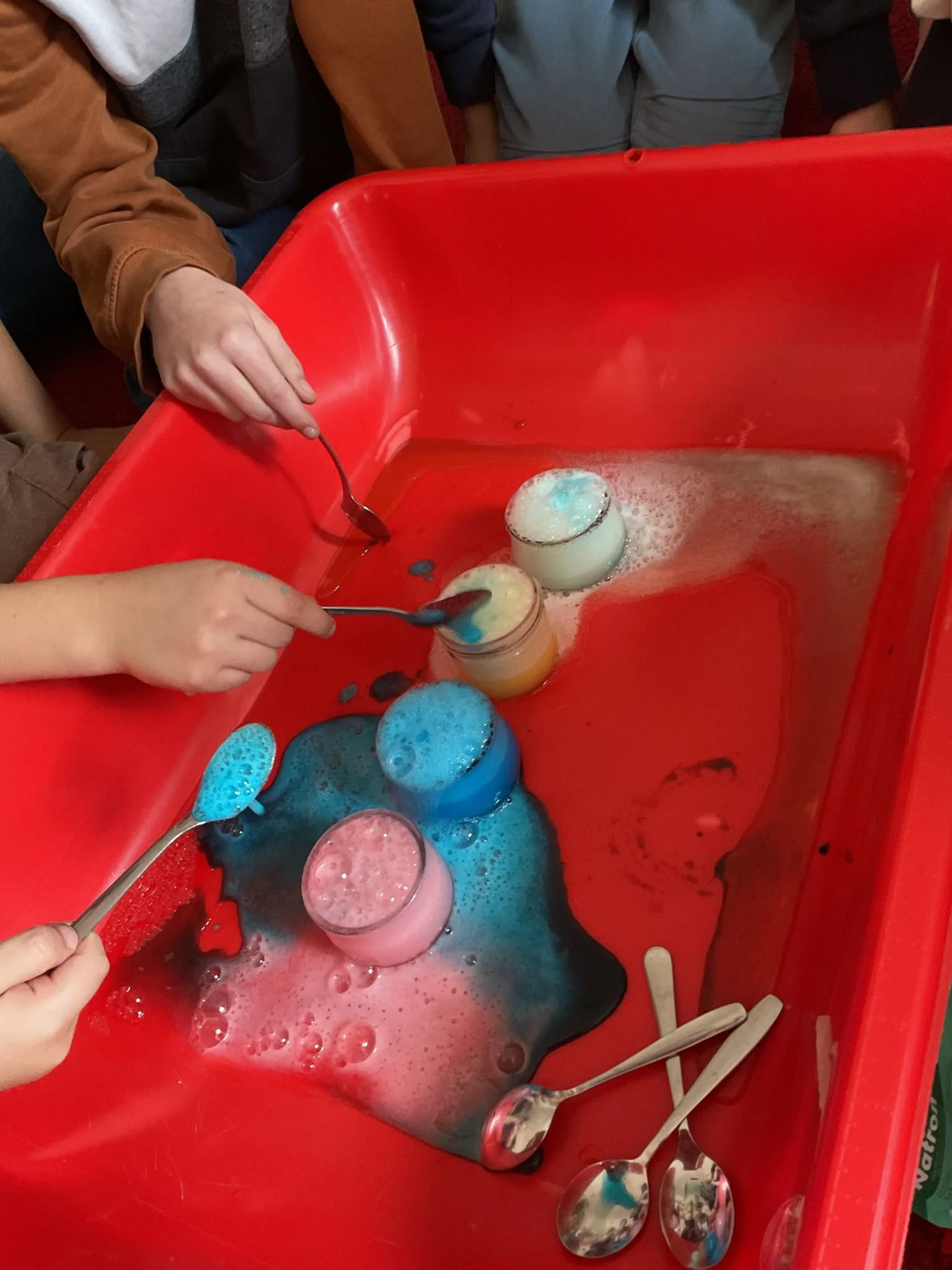 Mit Natron, Essig und Lebensmittelfarbe verwandelten die Kinder kleine Gefäße in sprudelnde Mini-Vulkane. Kaum traf der Essig auf das Natron, ging es los: Es schäumte, blubberte und spritzte in bunten Farben. Die Augen wurden groß und das Staunen noch größer.